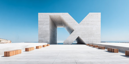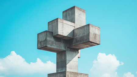 This modern abstract sculpture features a concrete cross structure set against a vibrant blue sky with fluffy clouds, highlighting minimalist design.