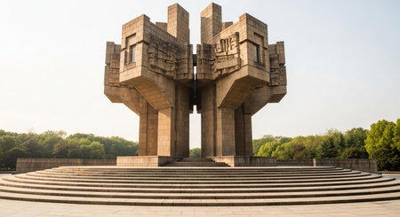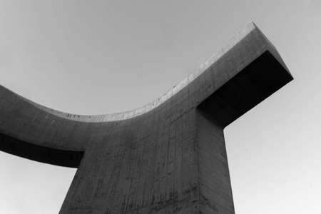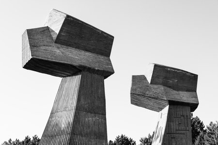 August 2020 - Bubanj Nis, Serbia: Socialist Brutalism Modernism abandoned communist huge concrete monument in shape of fists - symbol of resistance of partisans against fascism black and white photo