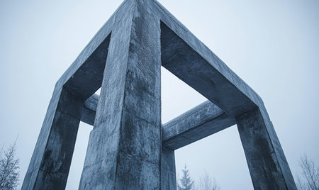 A large abstract concrete structure rises from the ground shrouded in fog. Surrounding trees create a mysterious atmosphere in the cold winter setting enhancing the edifices enigmatic presence.