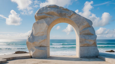 AI Generated. Stone arch sculpture framing scenic ocean view on sunny day
