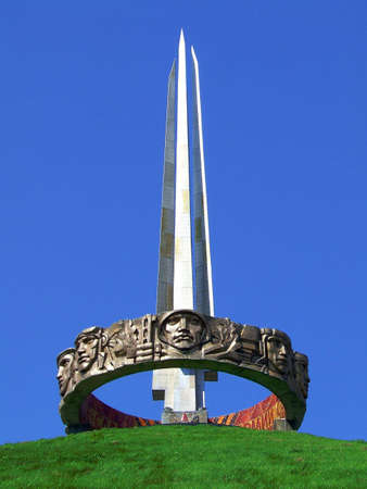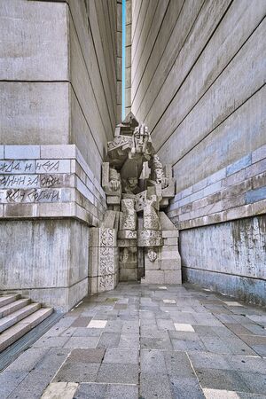 SHUMEN, BULGARIA - December 16, 2017: The Monument to 1300 Years of Bulgaria, also known as the Founders of the Bulgarian State Monument designed by Bulgarian sculptors Krum Damyanov and Ivan Slavov
