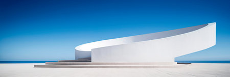 The showcases a striking architectural structure characterized by sharp, angular lines and a predominantly white color scheme. The structure a series of vertical and horizontal that converge into a sleek, futuristic A prominent red circular is integrated into the structure, adding a bold contrast against the white and the blue sky backdrop. The overall composition is abstract and minimalist, evoking a sense of modernity and innovation. The clean lines and geometric shapes contribute to a...