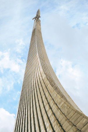 Moscow, Russia - July 21, 2021: To the Conquerors of Space - a monument in memory of the achievements of the Soviet people in the exploration of outer space. bottom up view.