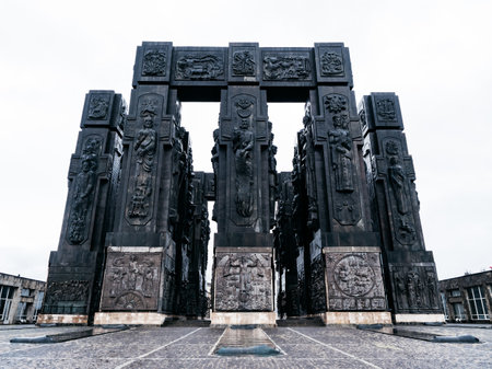 Chronicles of Georgia, monument history, design detail on black sculpture pillars, famous tourist attraction, located on Keeni hill near the Tbilisi sea, Georgia, with white fog sky after rain day.