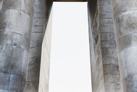 An opening between columns ,the building is covered with marble ,in the foreground two round columns ,wide angle lens ,