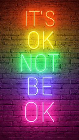 Neon sign on brick wall reads it s ok not be ok in rainbow colors