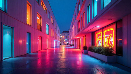 Vivid neon lights create an energetic urban atmosphere at night