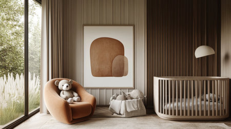 This cozy and modern nursery features a minimalist design with natural decor elements, ensuring a warm and inviting atmosphere for babies and families.