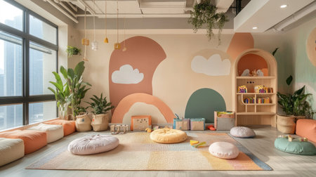 A beautifully arranged daycare playroom with artistic wall designs, hands-on learning materials, and plenty of soft play cushions.