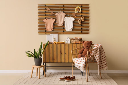 Colorful carpet in bright baby's room with wooden furniture and plant on white cabinet