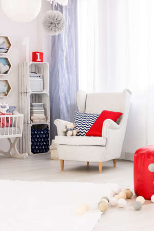 Child room in marine style with white furniture, comfortable armchair and stylish decorations