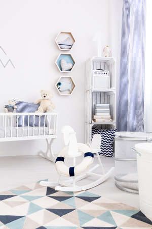 Baby room in scandinavian style with rocking horse, white cot