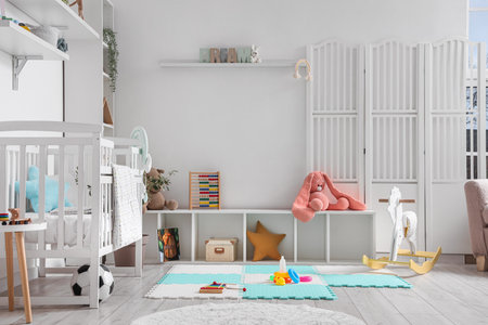 Stylish interior of children's room with baby bed and toys