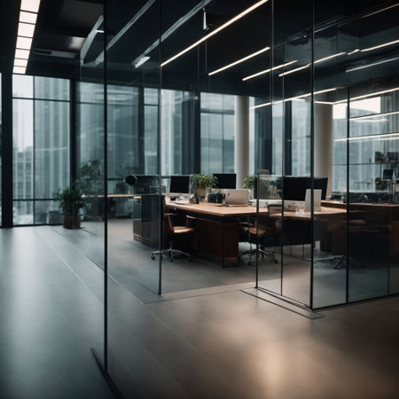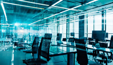High-tech office with a minimalist design featuring smart lighting systems and ergonomic workstations. Glass partitions and natural wood materials are