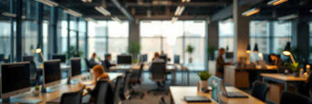 Modern office space bustling with professionals engaged in various work activities during daylight hours