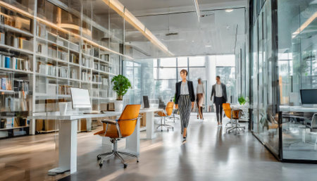 A vibrant business workplace showcasing blurred motion of people walking in a contemporary office environment. This image highlights collaboration, productivity, and the dynamic energy of modern