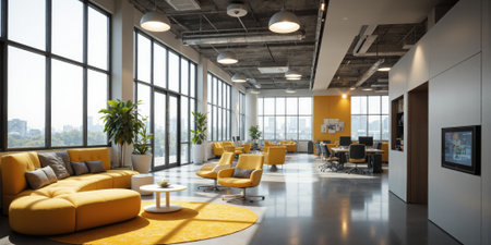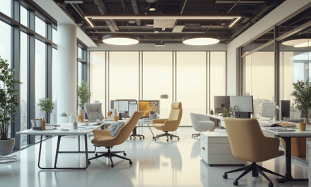 A well-lit, spacious co-working office space with stylish furniture, large windows, and an inviting atmosphere for collaboration and productivity.. AI Generation