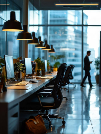 Spacious and modern office interior featuring plants, ambient lighting, and organized workstations, creating a vibrant and inviting atmosphere for productivity.