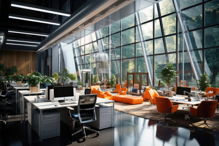 Modern office with sleek design and computer workstations in open layout. That the image is generated using AI.