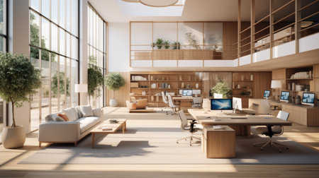 Inspiring office interior design Scandinavian style Corporate Office with Open Space Design featuring Natural elements architecture. Generative AI AIG 31.