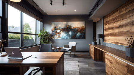 Inspiring office interior design Contemporary style Office featuring Wall of windows architecture. Generative AI AIG 31.