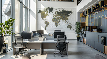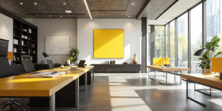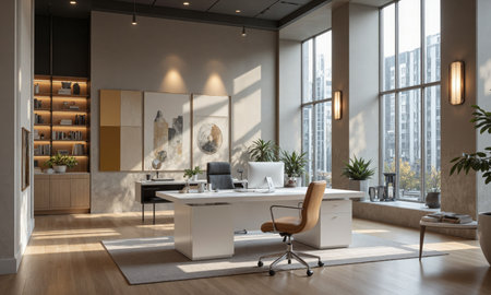 Office Design Modern Workspace Sunlight: Contemporary office interior design showcasing a bright, sunny workspace with modern furniture and large windows.