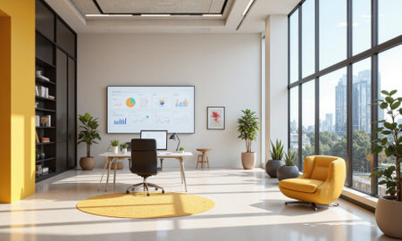 A bright, modern office space with large windows and colorful accents, promoting productivity and creativity.