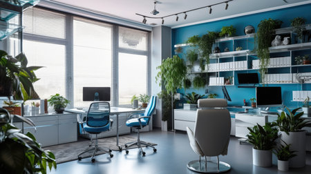 In a colorful office, desks and chairs are neatly arranged, but there is nobody in sight. The vibrant atmosphere awaits the hustle and bustle of a busy workday. Generative AI