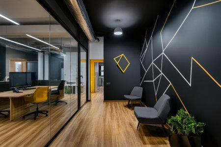 Modern office interior with a black wall, white and geometric decoration on the right side of the photo. Wooden floor, glass door, mock-up for design or presentation. --ar 3:2 --v 6.1 Job ID: faad352b-a716-4929-8a99-c788ffb7bc1a