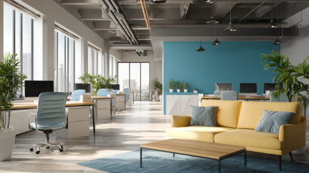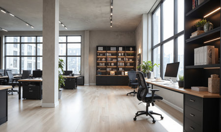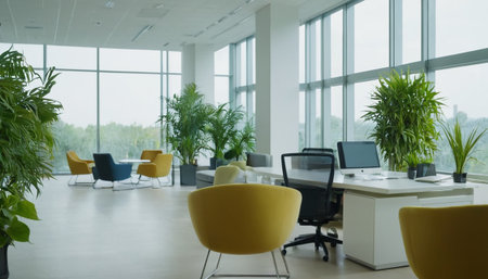 Spacious office features modern desks stylish seating and plenty of natural light. Plants add freshness to the professional environment on a sunny day.