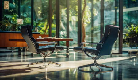 Modern office interior with black chairs, table and window. Nobody inside