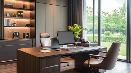 An office with a desk and computer in front of a window, AI