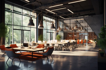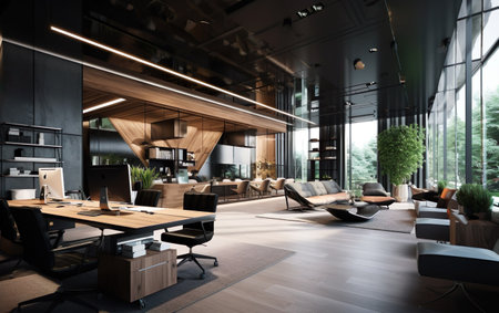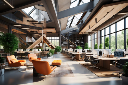 Spacious office interior with modern design, wooden elements, and large windows, bright daylight, concept of architecture