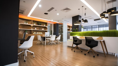 Modern eco friendly office interior design showing sustainable elements and innovative aesthetics