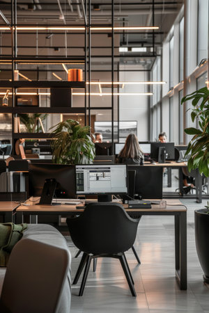 A contemporary office setting showcases expansive glass windows allowing natural light. Modern desks and ergonomic chairs fill the space, creating an inviting work environment.