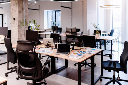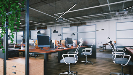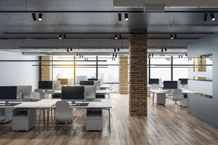 Interior of modern industrial office with desks and computers. Empty open space office with essential amenities. Stylish coworking area with furniture.
