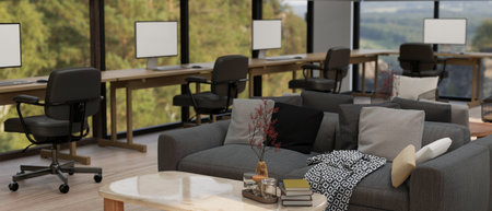 Modern company office building with relaxation space, comfortable sofa, coffee table, office chairs, computer desk and office supplies. 3d render, 3d illustration
