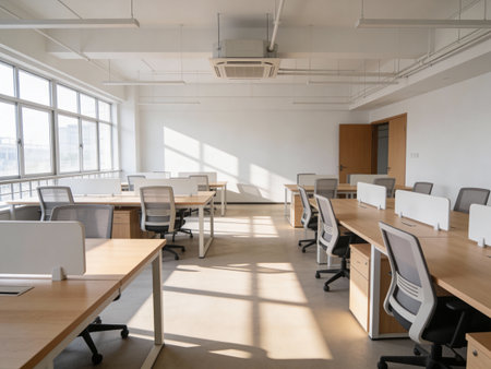 Interior of modern open space office with wooden tables and chairs. Nobody inside