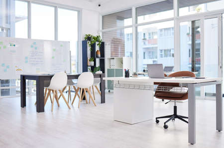 Laptop, desk and documents in empty office for meeting, discussion or boardroom for planning. Paperwork, markers and technology for corporate interior with furniture and chairs in workplace.