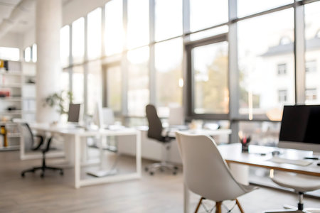 Blurred background of modern open space office with white furniture and equipment