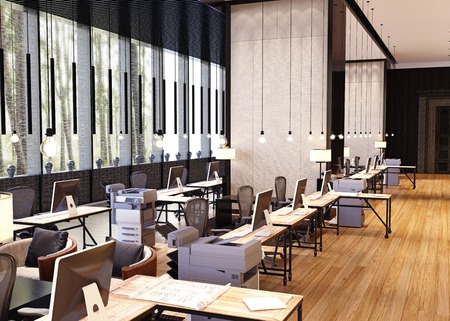 Modern office interior with furniture and equipment. Workplace in modern office
