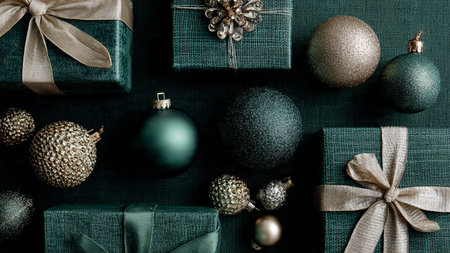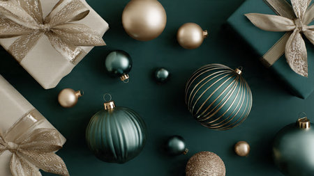 Luxurious Christmas design with soft light illuminating gold ornaments on an emerald surface.