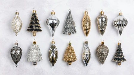A stunning collection of Christmas ornaments showcases silver, gold, and black colors. Perfect for inspiring holiday decor and adding elegance to seasonal decorations.