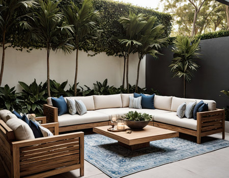 A serene garden space featuring a modern outdoor lounge set with plush cushions, highlighting relaxation and contemporary design in a sunny environment.