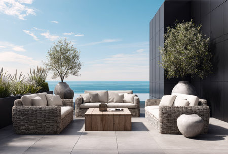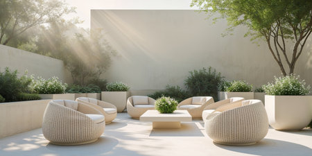 AI Generated. Modern outdoor patio with woven seating and contemporary planters in a serene setting