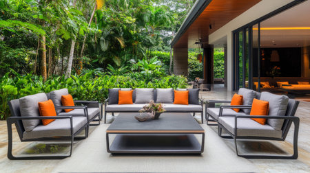 A stylish outdoor lounge area featuring modern furniture and vibrant cushions, surrounded by lush tropical greenery, perfect for relaxation and entertainment.