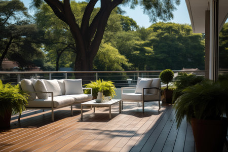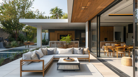 Modern patio with stylish furniture, natural light, outdoor living