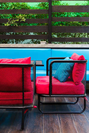 outdoor chairs with cushions and tables for a smoke break and snack on the street near the office center. place for a break