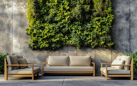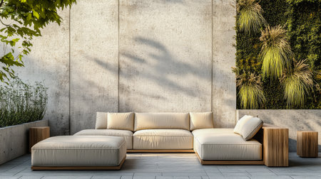 A contemporary outdoor lounge features a spacious sectional sofa paired with wooden side tables. The backdrop highlights a lush vertical garden, with sunlight casting soft shadows.
