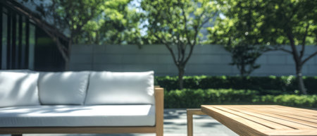 An outdoor living area features wooden sofas and a coffee table arranged on a paved surface. Green plants and trees surround the seating area creating a relaxing ambiance. The scene is bathed in natural sunlight suggesting a daytime setting. This image is suitable for various commercial and editorial applications.